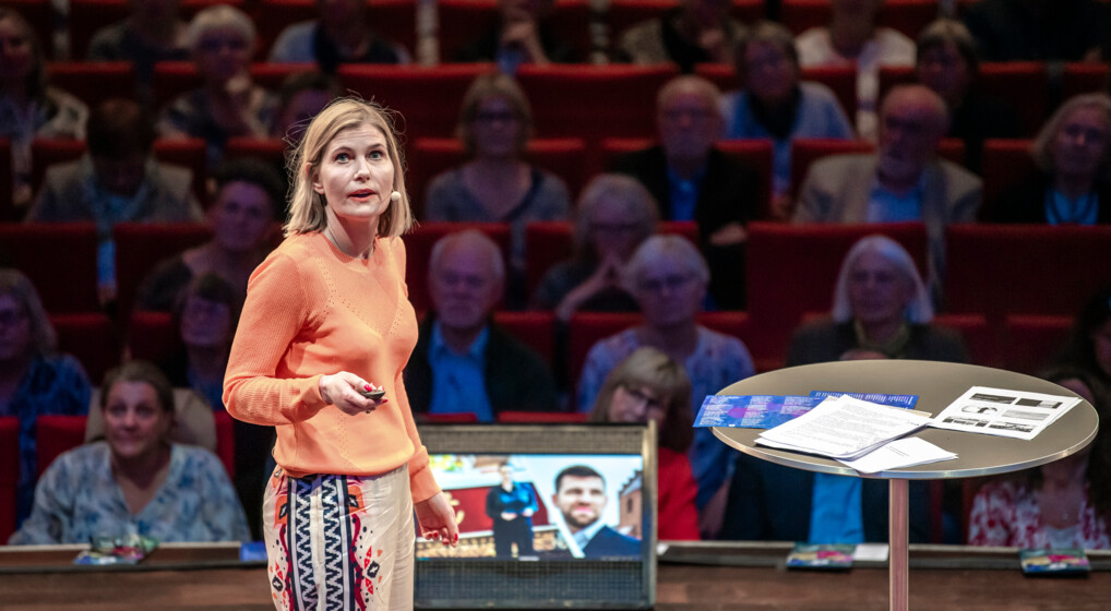 Journalist og debattør Anna Libak hopper (også bogstaveligt talt) på scenen som næste taler, og rejser spørgsmålet ”I hvilken grad er Danmark et kristent land?”