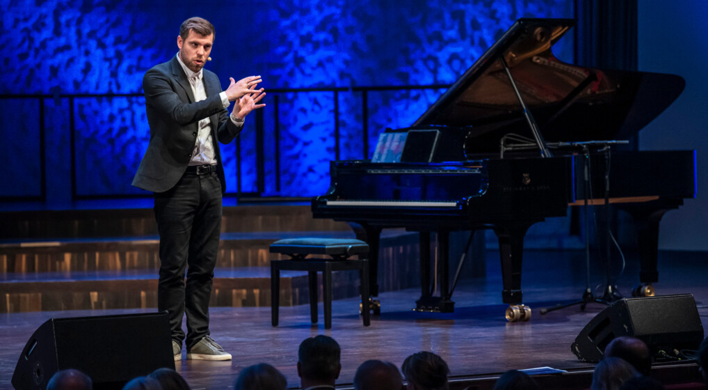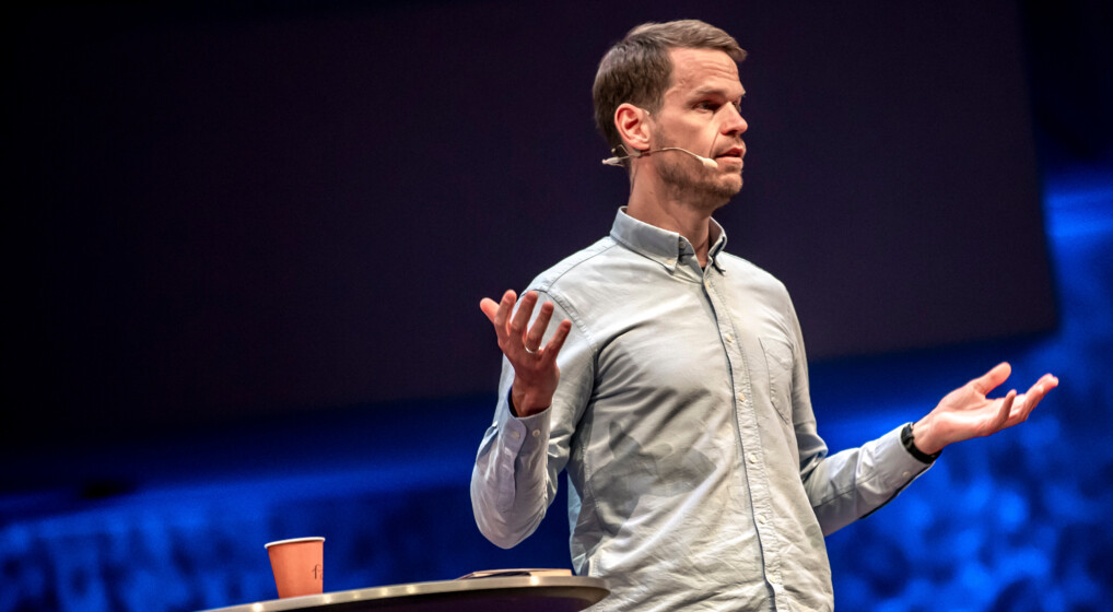 Kirkeminister Morten Dahlin hopper (bogstaveligt talt) på scenen i den store sal i Musikkens Hus, som første gæstetaler på programmet.