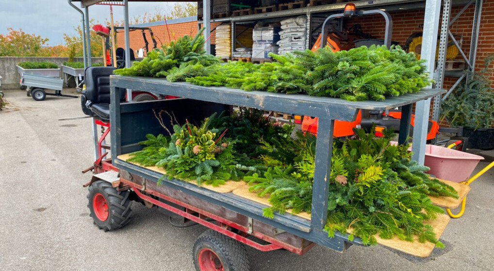 På Thisted Kirkegårde har man tre slags granpynt, der er tilpasset traditionelle urnegravsteder, plænegravsteder og traditionelle kistegravsteder. Gravstedsejerne betaler for pynten. Når dekorationer, buketter og granhaler er færdige i maskinhallen, køres de ud til gravstederne, hvor de bliver arrangeret. Foto: Thisted Kirkegårde