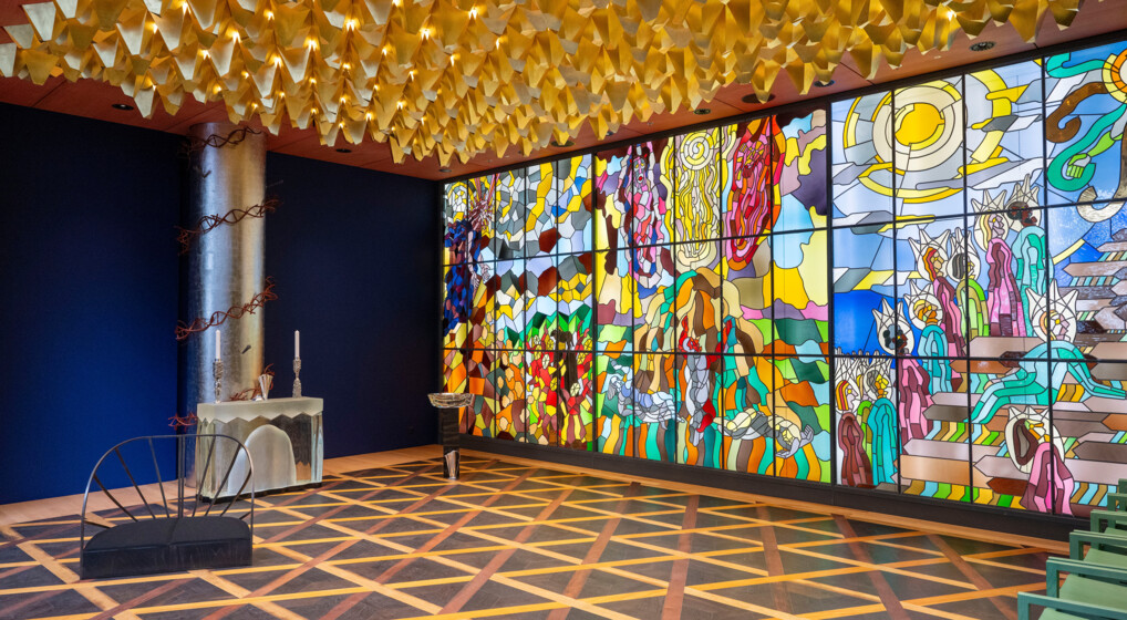 Kunstner Bjørn Nørgaard har totaludsmykket det nye kirkerum med en tredelt glasmosaik med bibelske fortællinger, forgyldt loft i sekskanter samt alter og døbefont i krystalklart glas. Det er et unikt rum til kirkelige handlinger, refleksion og fordybelse for patienter, pårørende og personale. Rummet er integreret i en af hospitalsfoyerens træbeklædte bokse og indgår som en del af samlede arkitektur i byggeriet. Skydedørene på den ene langside kan åbnes mod foyeren, så rummet kan indgå i større arrangementer. Foto: Lars Horn / Baghuset