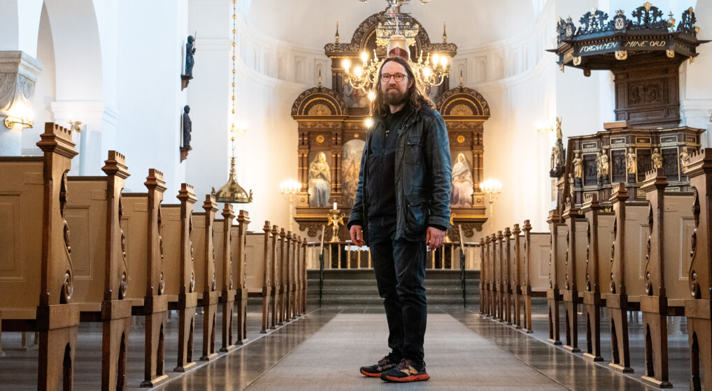 Fra tid til anden har Frans Rossing Andersson samtaler med nogle af de hjemløse på kirkebænkene i Vor Frue Kirke. Det er også her, han jævnligt holder gudstjenester og står for de fleste bisættelser og begravelser af de udsatte. Foto: Anika Thorø Weber