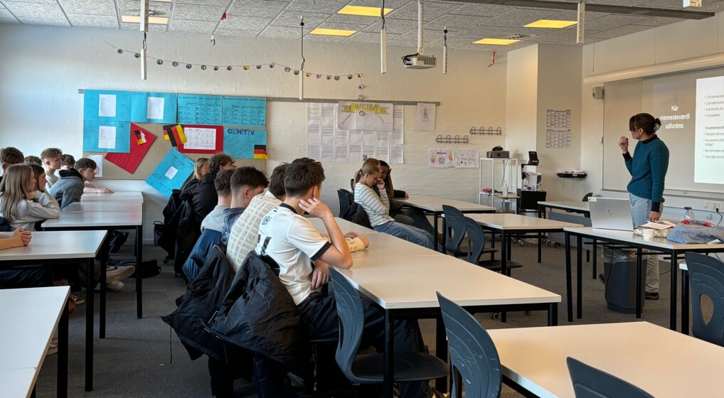 Gymnasiepræst Sofie Gjørup Winkel fortalte elever i 9. klasse om begrebet værdier, da Hvad er Meningen? blev afholdt på Fjerritslev Gymnasium 14. januar 2026. Foto: Anna Margrethe Dige Saxild
